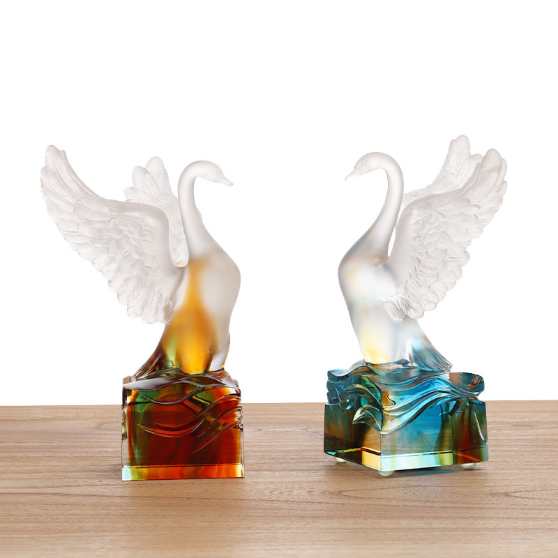 Pokud jde o barvu, skleněná labuť přijímá gradientní barevné provedení, postupně přechází z bílé hlavy do oranžově žlutého těla a poté do tmavě červené základny. Tato změna barvy nejen zvyšuje vizuální vrstvení, ale také dodává labuti teplý a slavnostní temperament.