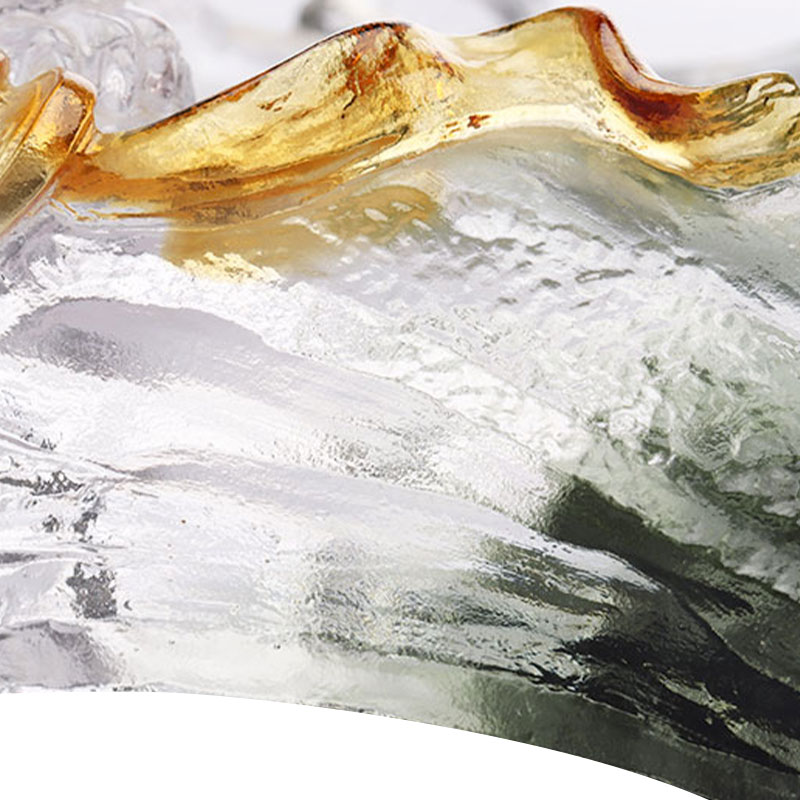 Na těchto tmavě zelených horách je mrštný tmavě fialový černý panter, který v tlamě drží šňůru jantarových měděných mincí. Měděné mince jsou hřejivé a průsvitné, což kontrastuje s tajemnou hloubkou černého pantera a poklidnou tmavou zelení hor a dodává celému ovocnému talíři jedinečnou živost a luxus. Křišťálová čistota skleněného materiálu činí tuto scénu živou, což z ní činí vynikající nádobu s uměleckou krásou i řemeslnou hodnotou. Ať už se jedná o praktický ovocný talíř nebo uměleckou ozdobu, vyzařuje okouzlující kouzlo, přitahuje pozornost a zaujme.