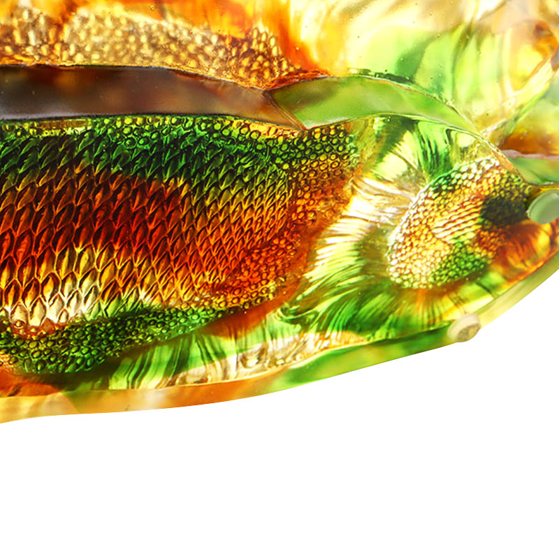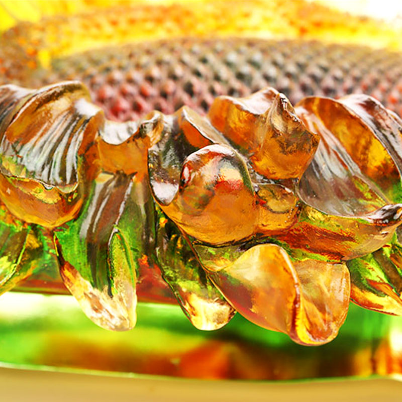 Barevná glazura orientovaná proti slunci se zdá být kondenzována slunečním světlem. Každá čára na talíři je jako stopy zanechané slunečním světlem na okvětních lístcích, zářící zlatým světlem. Díky dokonalému řemeslnému zpracování je vitalita a síla slunečnic věčně fixována v barevné glazuře. Červené ovoce na talíři je jasné jako plameny a dodává tomuto nádhernému talíři obrácenému ke slunci nádech živé barvy. Není to jen umělecké dílo, ale také žádoucí spojení slunečního světla a života. Může vydávat teplo a radost, když je tam umístěna potichu.